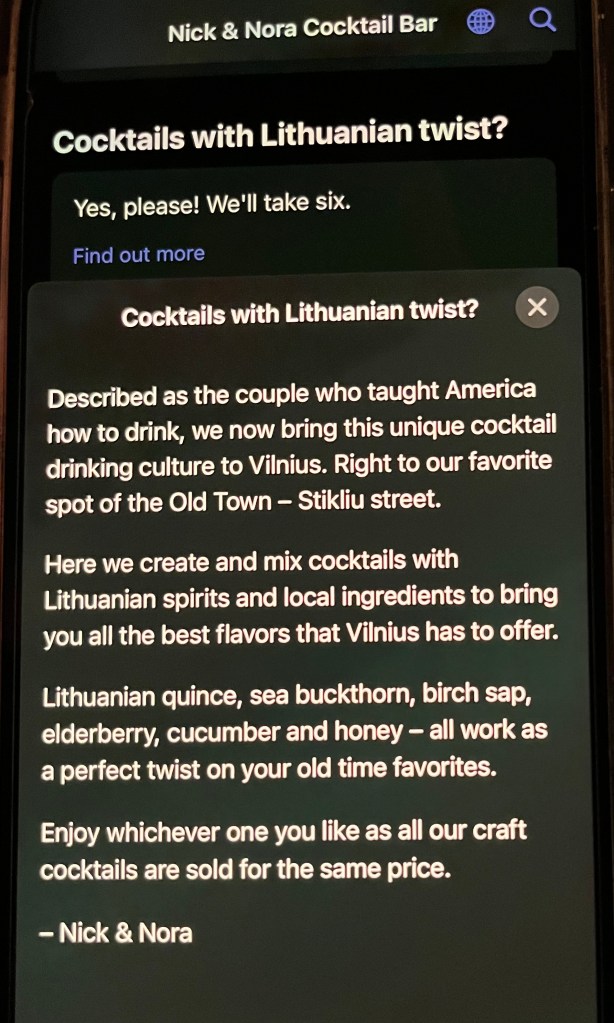 We ended the evening with a surprise. We were heading up the street where we had our pre-dinner drinks and dinner as we had seen lots of people walking up and down the street the whole time we were there and wanted to see what was up the street. We passed a cocktail bar that was dedicated to Nick and Nora Charles (the main characters of the Thin Man movie series from the 1930-40s). Nick and Nora are notorious for drinking and especially cocktails. The bar Nick and Nora says they make traditional cocktails with Lithuanian sprits and ingredients. The bar has many phones of the movie characters. I made Tom stop and have a drink as I a huge fan of the movies and they are great fun.