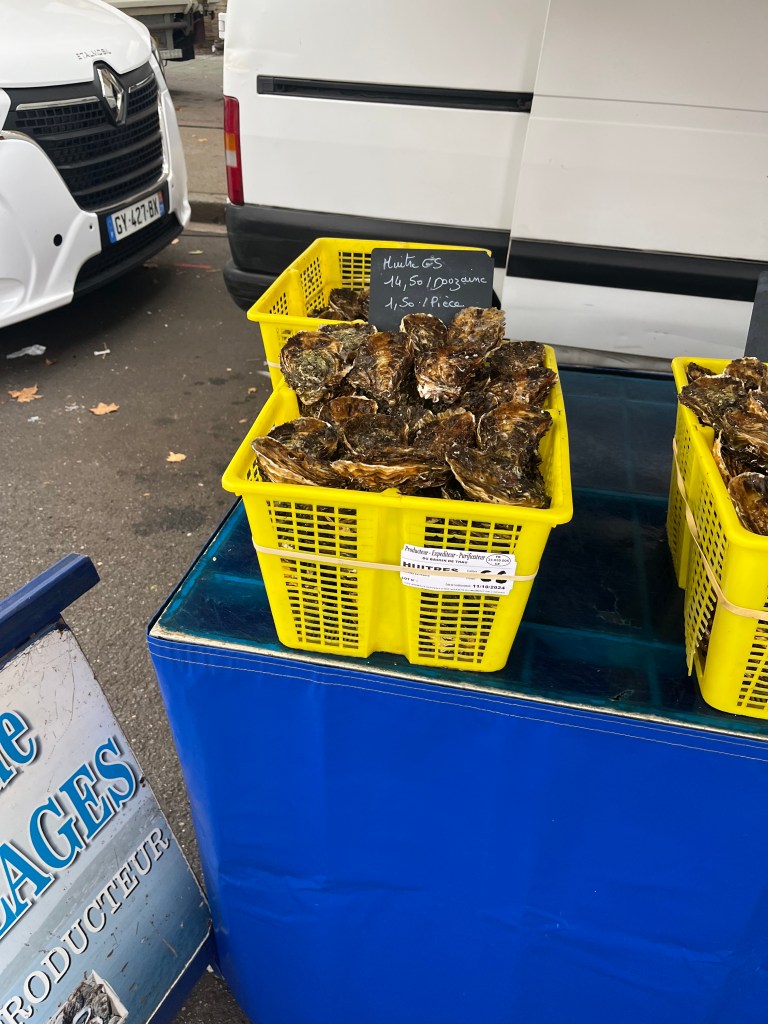 I got up and went to the open air market at St. Aubin. It is one of my favorite activities as there is so much going on there. There are book stands, shoe stands, jewelry, honey for sale, wine for sale, street food and produce vendors. I have wanted to try the paella that is being cooked in pans that are probably four feet round but I go early in the morning so am not really hungry for paella. I, also, want to buy some of the oysters but do not have a knife to open them when I get back to the apartment so have resisted so far. I do buy cheese, olives and produce. It seems to be cheaper than the Victor Hugo Marche so I like that aspect as well.