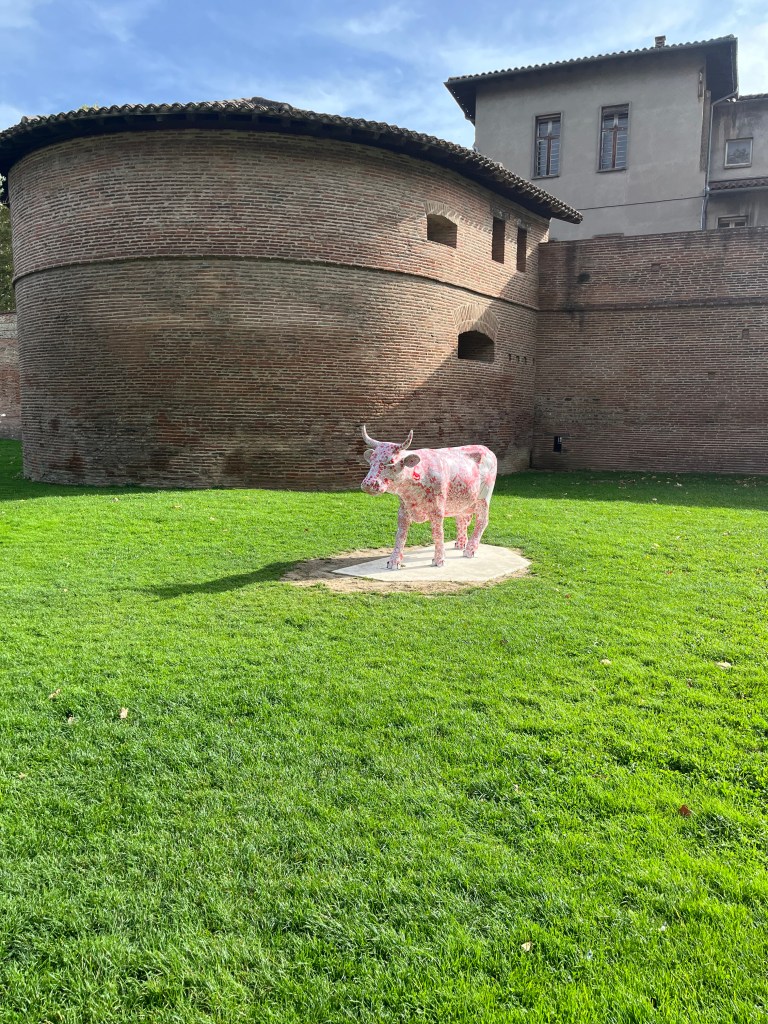 After shopping, I was wandering back towards the pedestrian bridge across the river and ran across a park that had some outside sculptures. One was a cow that was brightly decorated, I am not sure why it is in the park but it was fun to see. The juxtaposition against its background was interesting. It sits behind a historic building that is now a hospital. One of the plaques near the statue discussed the siege and conquest of the city during the crusade against the Cahors in the early 1200s. I do not think the building is that old but it is very old. There is also a museum attached to the gardens and I am going to have to go back and visit it. It was not open today so that is a project for another day.