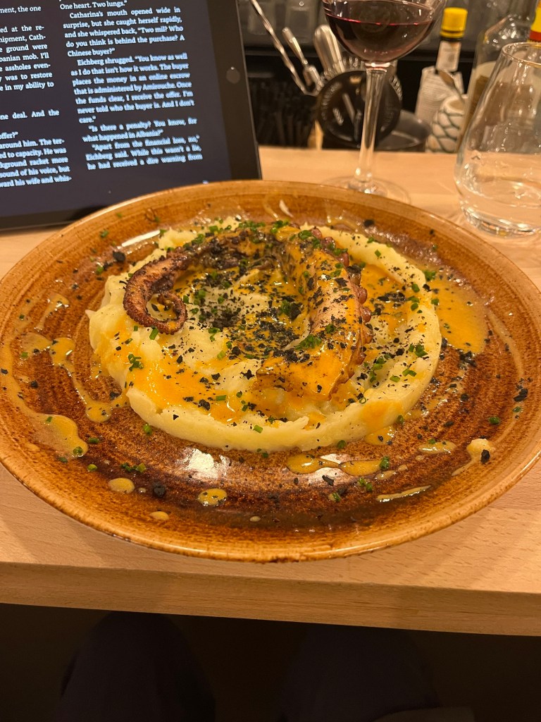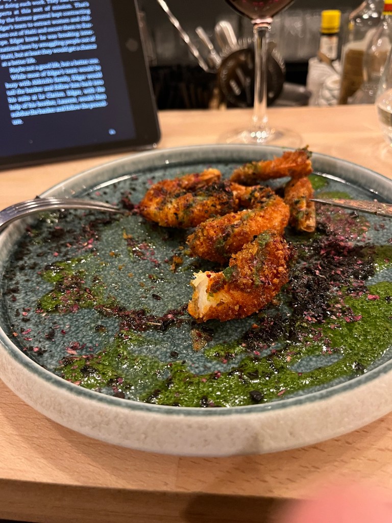 I ordered a glass of red wine and then ordered dinner. My choices were Gambas Panko (fried shrimp) and Poulpe (Octopus). I think the food is a French/Spanish fusion.