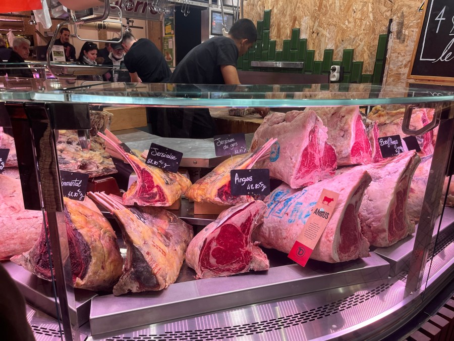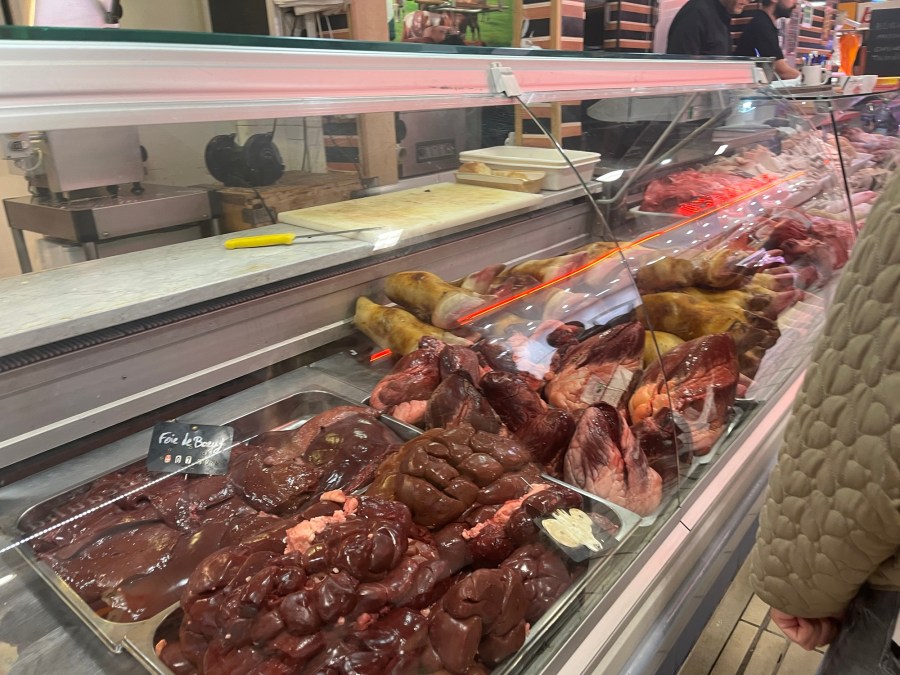 There are things that not many (if any) American would eat or buy. The French are into using the entire animal that is being butchered so there is a stand that is dedicated to offal – hearts, intestines, liver, gizzards, feet, heads, literally the entire animal.