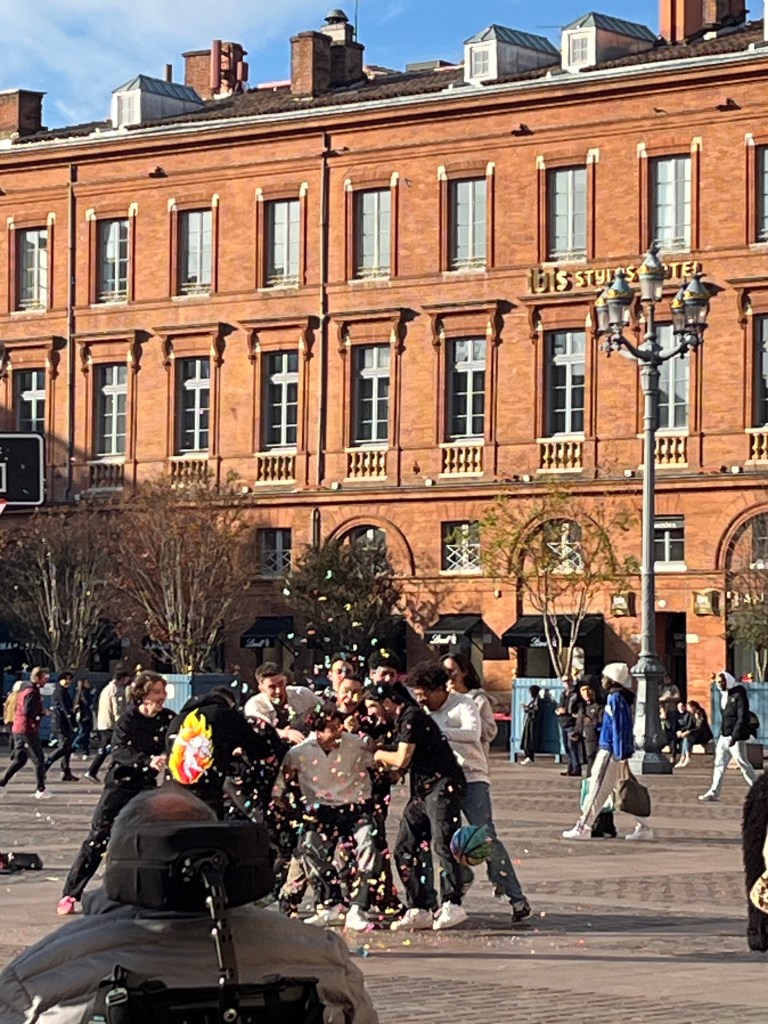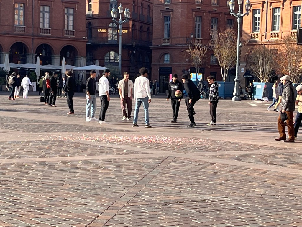 When I was walking back from lunch, I went through the Place de Capitole and a group of young men with a basketball hoop were goofing around. As I watched, I saw that they were filming a video of the activities. A group of the young men would lift the basketball hoop and run across the plaza to where another young man would be running with the hoop, they would plant the hoop and then the young man would shoot the basket. If he missed, they would start the whole process over again. If he made the basket, they would shoot off confetti and scream and grab him and jump up and down. I stopped to watch and they repeated it over and over again. I saw him make the basket three times. I am guessing that the video shots were not good enough for the first two times and they were repeating it to get better reactions. I am guessing it will be all edited into a video that they hope will go viral.