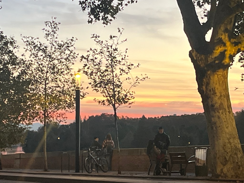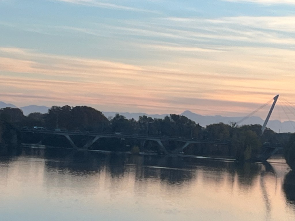 I went for my regular walk today and ended up being out and by river during sunset. I was on the Pont Neuf and decided to take a picture of the city. It gets a pink glow because of the red bricks but I could not get an angle that showed it being pink. I started looking around for other picture options and I looked sort of northwest at the sunset and I saw mountains in the background of the shot. They were fairly large mountains since I could see them easily. I had never seen the mountains in the distance before. There are three options: