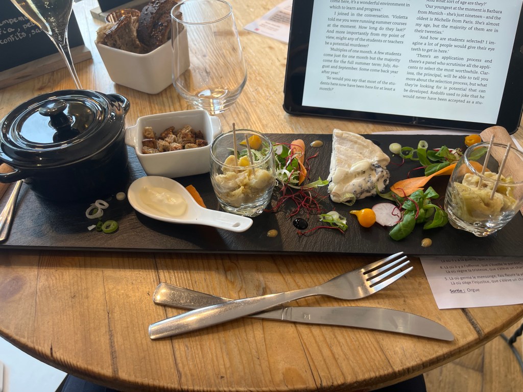 After church, I went to Parvis which was a champagne shop and restaurant. I had two glasses of champagne and tapas for lunch. I had a Ernst Remy, blanc de noir and a Legras, blanc de blanc. I had lentil and mushroom soup, Camembert with truffle oil and some mini-artichokes. It was a good and fun lunch.