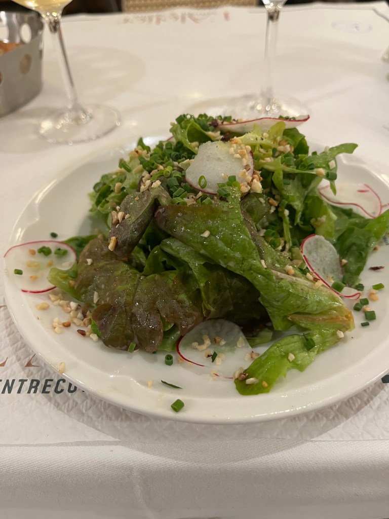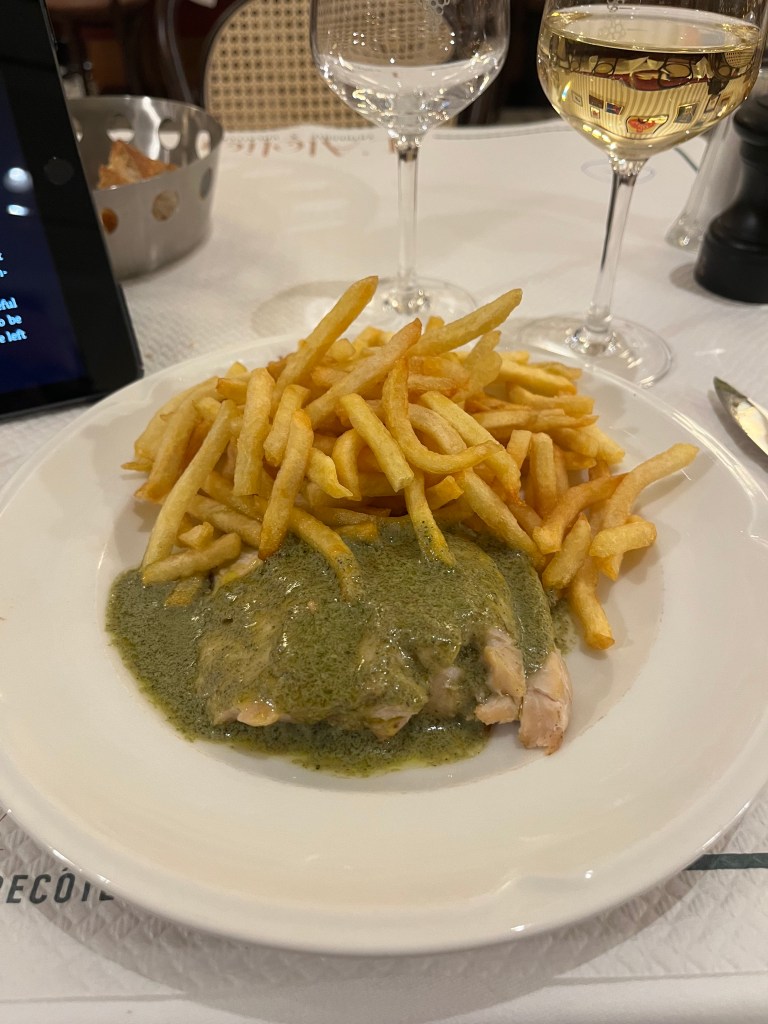 I had an interesting dinner at Entrocote. There plan is either beef or chicken grilled with a special sauce and French fries. They start you off with a salad. The meal was very simple but very good. Again, I am not sure how the French stay thin as the portion was pretty big. They even gave seconds on both the meat and the French fries.