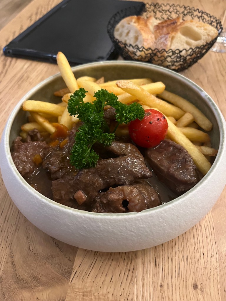 After relaxing a little while and recovering from all the champagne I had tasted today, I had dinner at l’Apostrophe. I had Beef Bourguignon which was excellent even though it was not quite cold enough to get the full comfort food feeling.