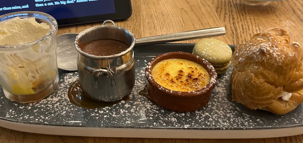 I indulged myself today with some of my favorite activities – running, exploring, drinking champagne, viewing art and just being mindful of the place where I am. My final indulgence was a great dessert assortment.