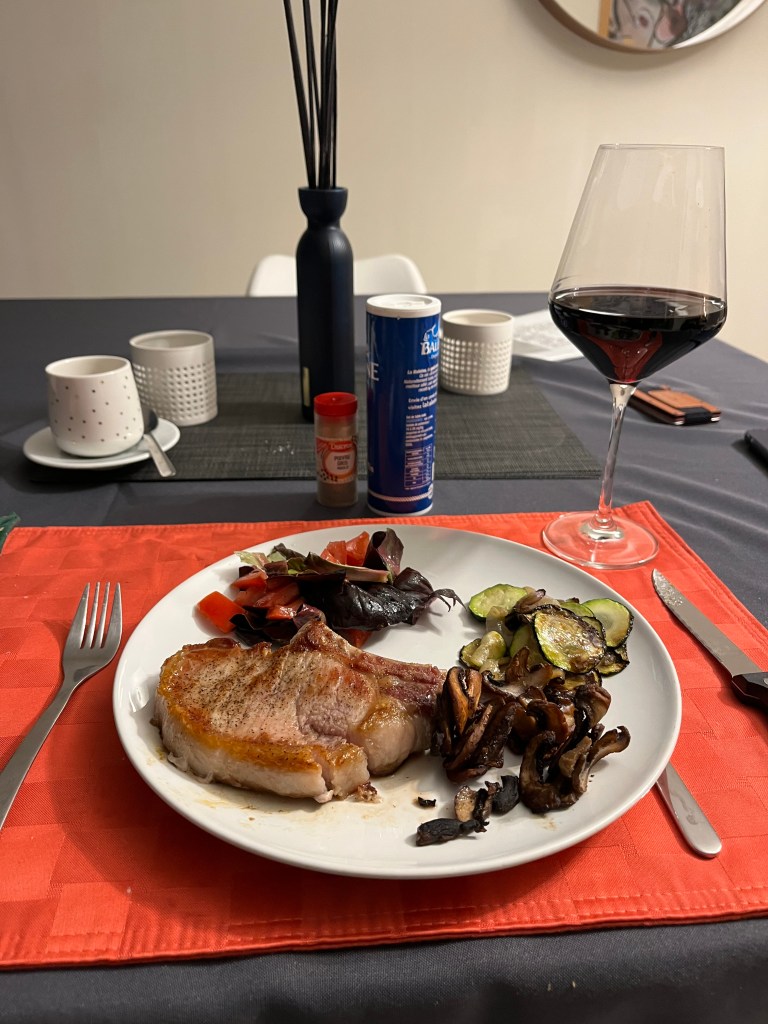 For dinner, I had a Côte de porc ibérique (a pork chop) but it must be a special cut because when I was buying it, the sales person asked me when I was going to eat it. I said that I was going to eat it tonight and he was willing to sell it to me. Not sure what would have happened if I told him another night. Whatever the reason, it was delicious and very tender. I made sautéed zucchini and had salad as well. Accompanied but a nice glass of Gaillac in my new wine glasses.