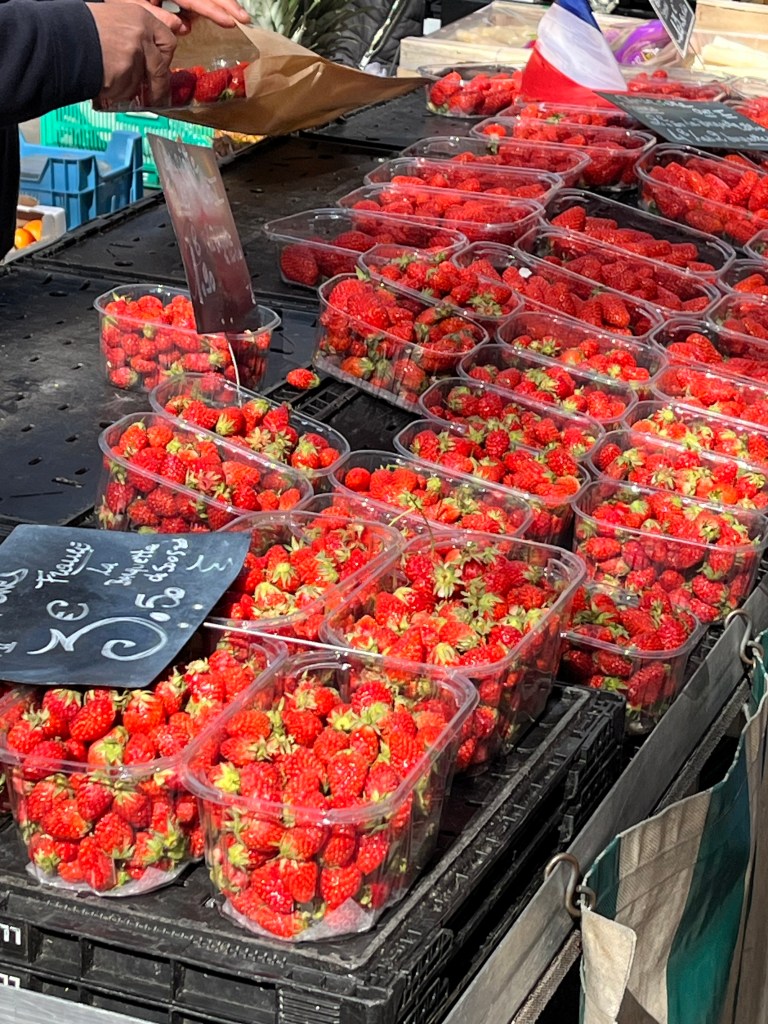 It is definitely strawberry season in France. There were tons of beautiful strawberries at lots of the stalls. They were either from France or Italy. I have bought strawberries a couple of times and they are very delicious.