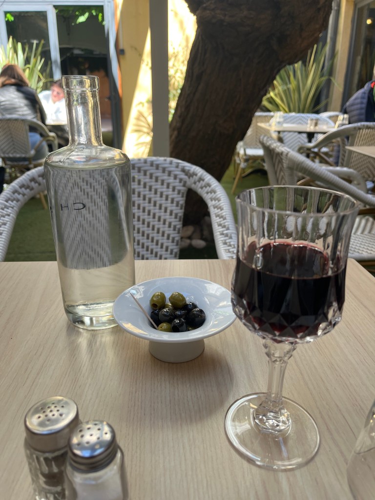 I was glad that I had done a lot of walking and was going to the run group after finishing lunch. I skipped dessert. The meal was Salade Lyonais, Grillade of porc avec pommes roti Romain, and a glass of local Froton wine. It was all delicious.