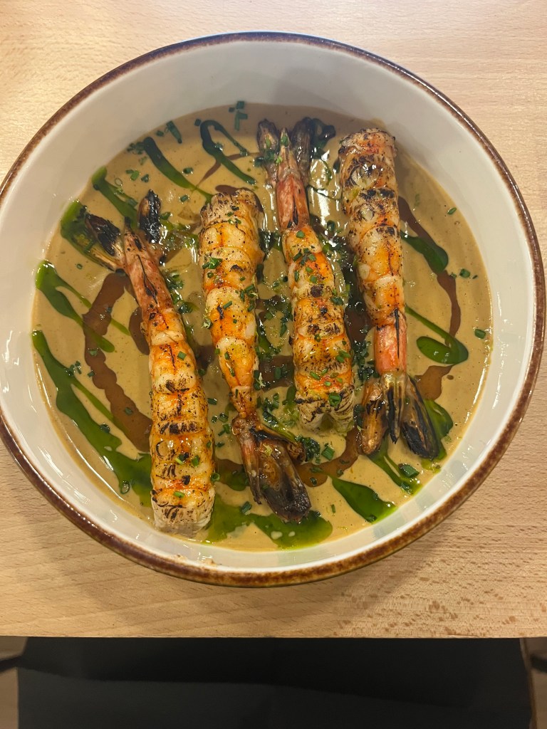 I had dinner at usual at Le Panache which is very good as always. Diego made me his signature cocktail for the evening which as a fruity strawberry drink but was very good. I find that Europeans seem to go for the more exotic cocktails rather than martinis or Old Fashions. I am working my way through the menu at Le Panache. Last night was grilled octopus in harissa sauce with roasted carrots. The carrots were whole and had been roasted and had a great caramelized skin on them. It was really good. I started with the grilled shrimp which is one of my favorites.