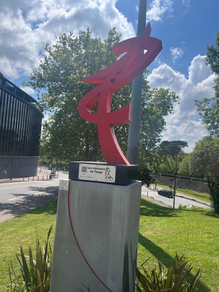 The road connects to the Garonne at the edge of the main part of the old town. I decided to walk over the bridge to see if I could see the Pyrenees in the distant. Unfortunately, the clouds blocked the view. The sun was shining and the day was beautiful but there were clouds around. As I approached the bridge I saw an outdoor modern sculpture. It is entitle the Tango Dancers.