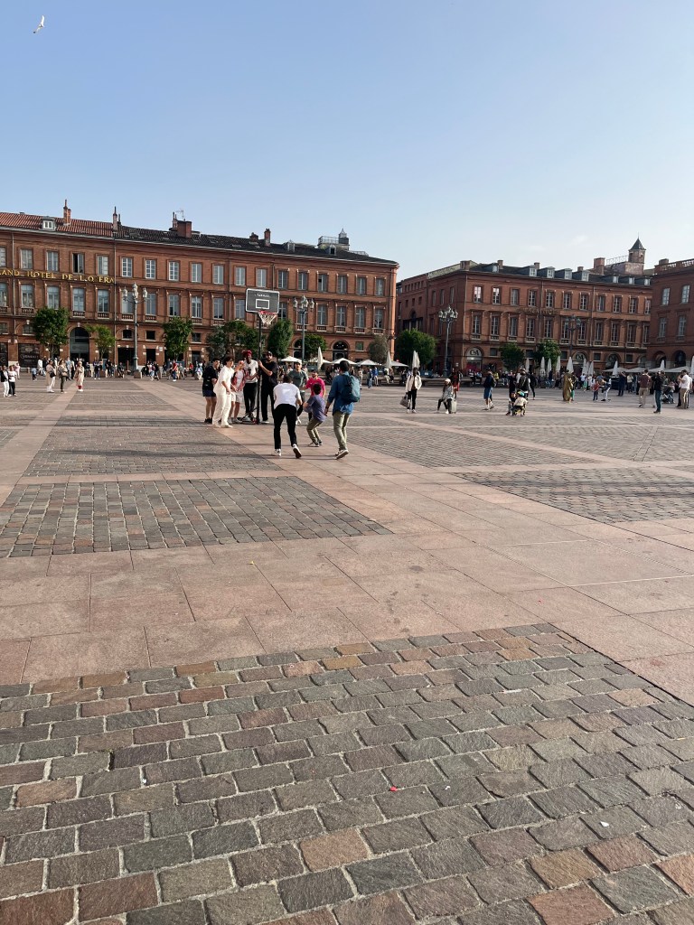The basketball boys were back in the Place du Capitole this evening. A group of boys run with a basketball hoop, plant it and then shoot the basketball at it. If someone makes the basket, they shoot of confetti and cheer. This time they got one of the mimes to shoot at the basket and amazingly he made it. I am not sure other than making videos for the Internet the purpose of it.