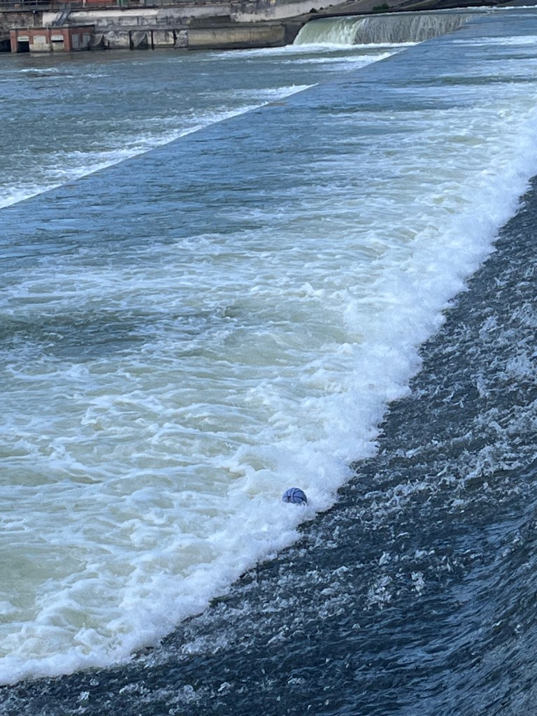 There is a man-made ford area of the river from the 1800s which acts like a waterfall. The last couple of days it is has been spectacular to watch. I had been monitoring a soccer ball that had been caught in the falls for a couple of day but the latest rain pushed it out.
