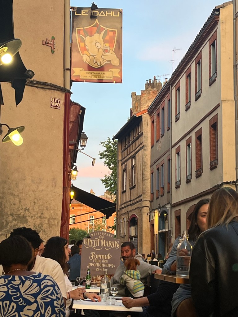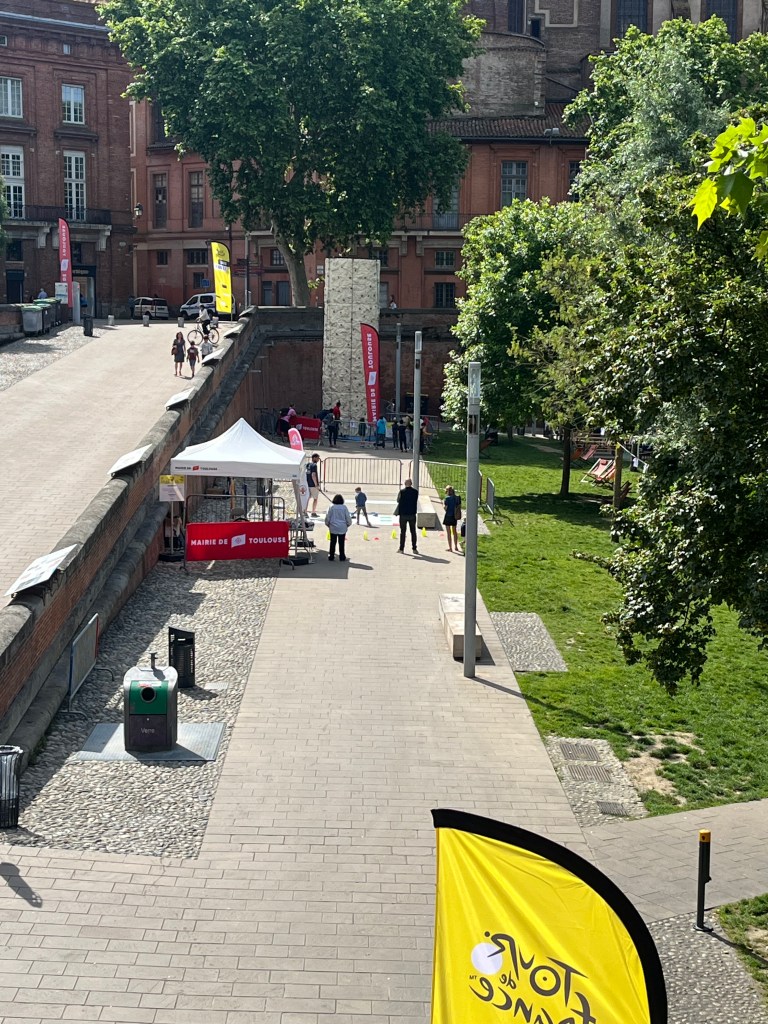 I did miss some of the activities in the city. They had a food festival in the Grand Rond park which I did not know was happening so I ran past it as it was closing. The Tour de France is going to have a stage in Toulouse and they are beginning to advertise it. They had a little Tour de France for kids in the Place St. Pierre. They set up a little course that seemed to have obstacles to immutable the stages of the Tour for the kids to ride through. They had police volunteers helping the kids. On the Quai de la Daurade there was a mini climbing wall set up and a kid hockey rink on the ground not ice. The city seems to be coming alive again as it was here when I was here in the fall.