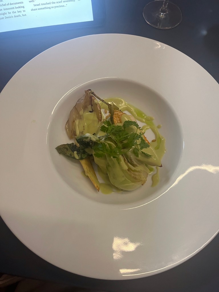 For my main course, I chose the Ballotine de Merlu (Hake), Jardiniere des Legumes Roti (roasted garden vegetales – bok choy, fennel, carrot and parsnips), Sauce Osielle. The chef explained that Osielle is sorrel. It was very good. The fish was super flakey and moist.