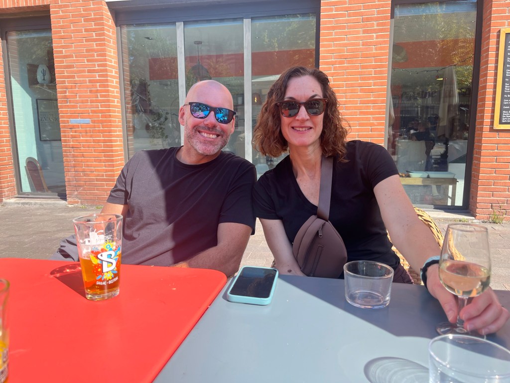 After the touring around we came back to the apartment for a little rest and then walked over to the cafe that is on the banks of the Garonne in the Saint Cyprien district and had a beer and enjoyed the nice weather. We learned about different beer drinks – a Monaco is like a shandy – beer and sparkling lemonade, a Picon has an orange syrup added to the beer and Panache has ginger beer added to the beer. I had never seen that really until today. Jen and a Picon and really enjoyed it.