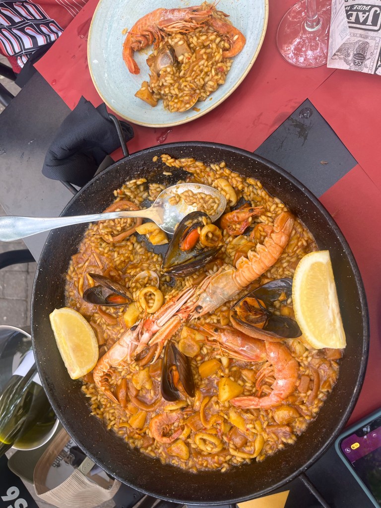 After the tour of the park, we headed down to a neighborhood that was quieter and found a plaza and had lunch. We had our paella, a very traditional Spanish dish of rice and seafood. It was fantastic. The restaurant was Bar Nou Candanchu. We had a nice bottle of Albariño as well. The weather was great so we sat outside and felt very Spanish. The waiter/owner was very amusing and super nice to us.