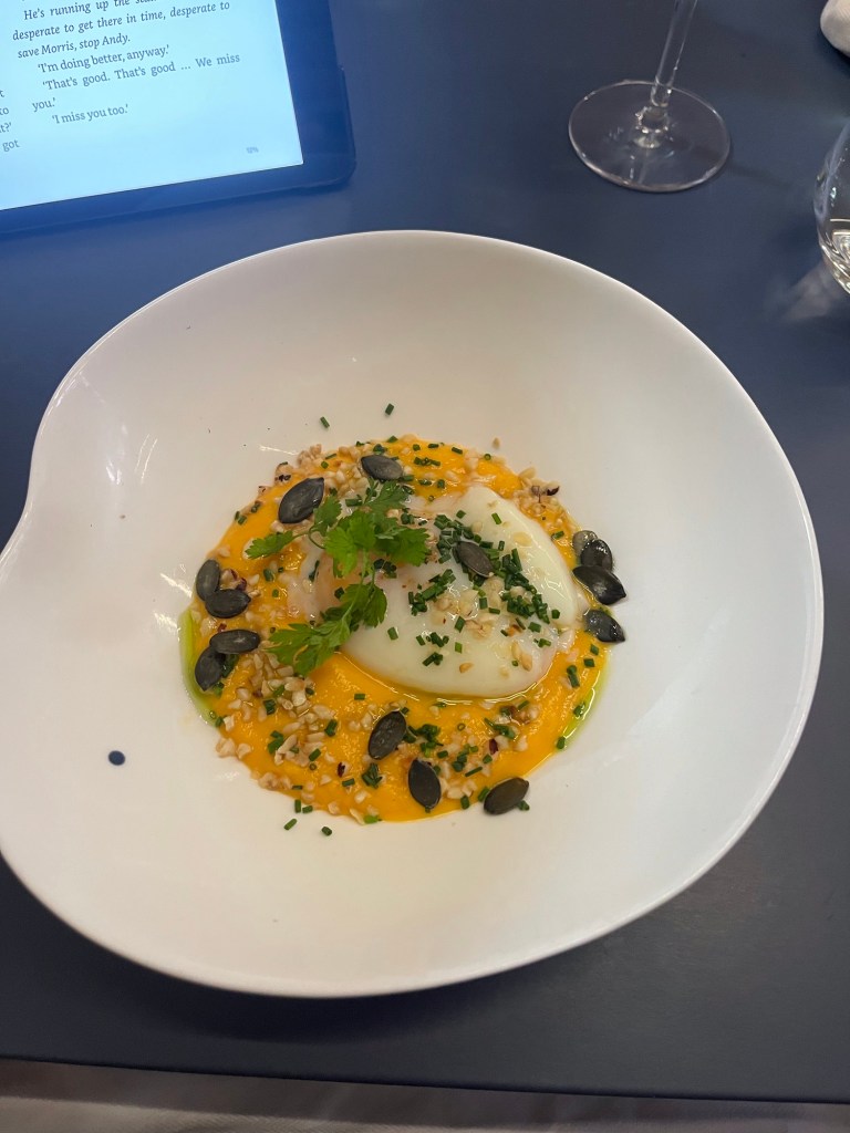 Lunch was great as usual. I had the butternut squash soup with a poached egg floating on it. Poached eggs are very common as part of appetizers here. I am generally not an egg person but I have tried a couple of these appetizers and they have all been good.