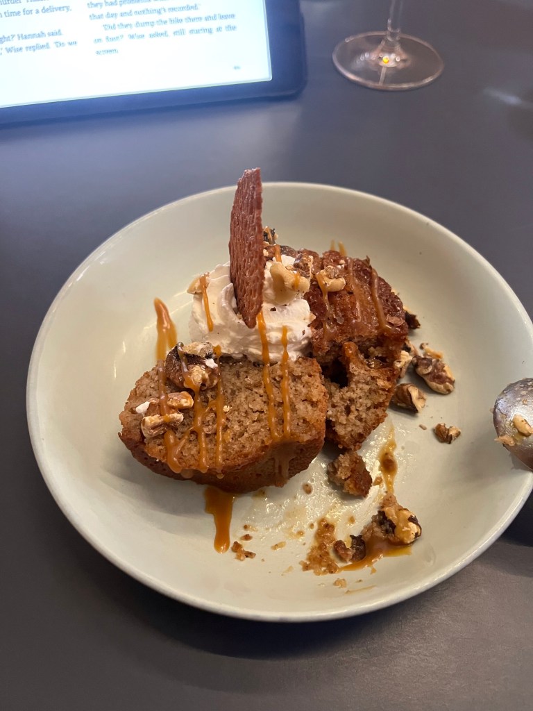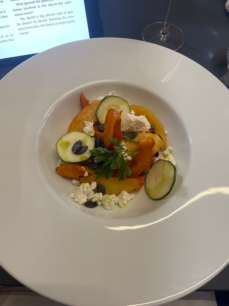 Since I had been eating so much for the week that Jesse and Jen were here, I decided to go with the vegetarian option for the main course. It was roasted pumpkin and other root vegetables on a bed of pumpkin purée. It was very filling and delicious but not overly filling which was good. It, also, had feta in it.