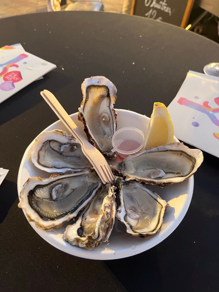 As well as the wine, you can buy charcuterie and other food. I was intrigued by the oyster stand. I love oysters so thought it would be fun to have some. The stand workers were shucking fresh oysters for each order. The oysters came with mignonette sauce, fresh lemons and forks to eat them. Six oysters cost 12 euros.