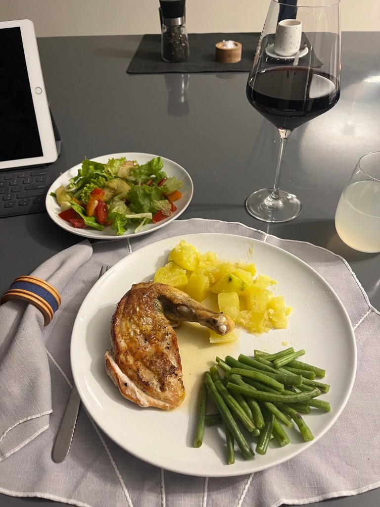 I looked up recipes for cooking the Supreme and it was very easy. I browned it in a little olive oil and butter on both sides and then baked it for about fourteen minutes. It turned out very good. I liked it and it is definitely moist when cooked. The recipe said cook vegetables with it so I boiled some potatoes in chicken growth and then baked them with the breast. The other sides were haricot verts (green beans) and salad.