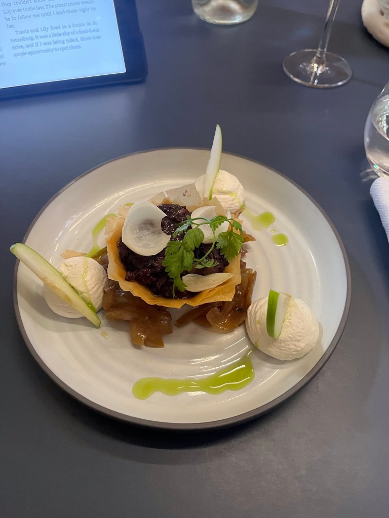 Today, I opted for the Tartlette Fine, Boudin Noir, Pommes and Onions. This was a tart made of phyllo pastry, boudin noir (a type of sausage) softened with a sauce with apples baked in a muffin pan and with apples and caramelized onions as garnish. It was very creative and tasted delicious. Again, the chef is great with flavors and texture.