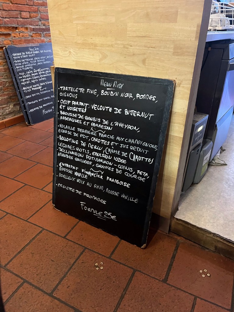 The menu is a chalkboard with three appetizers, three entrees and three dessert options. All for 25 euros.