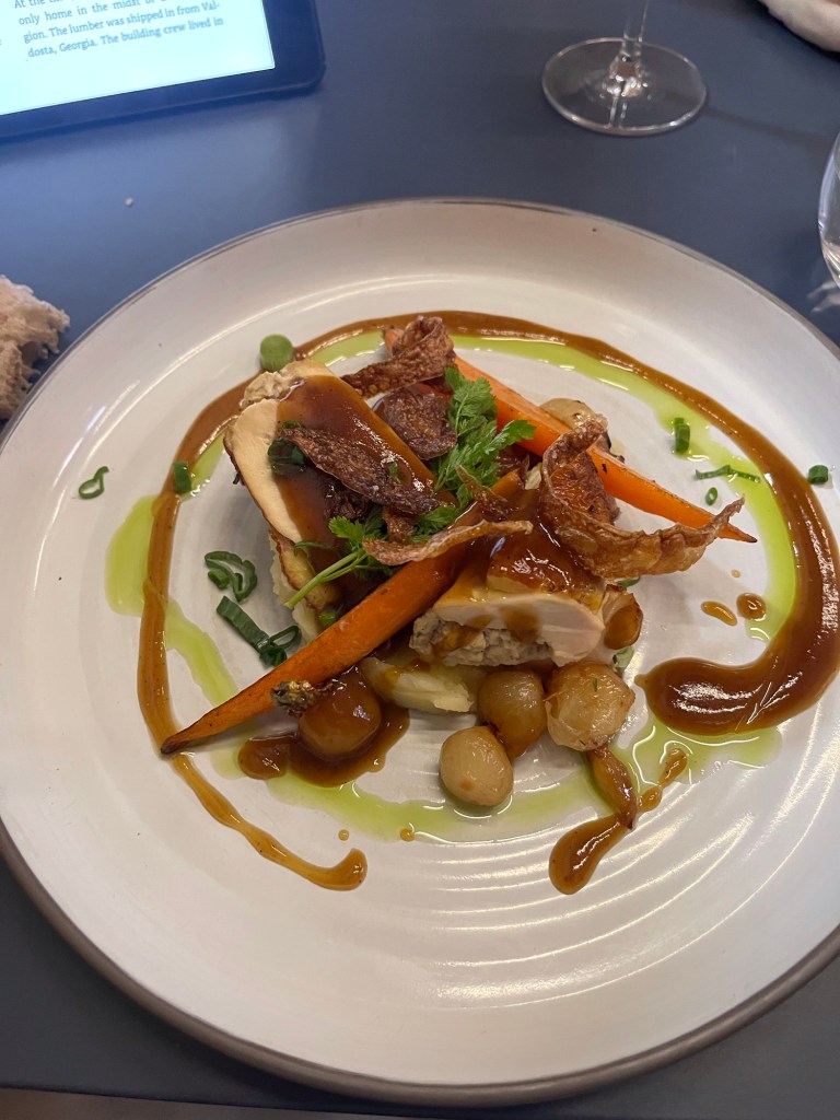 For my main course, I had Volaille Ferniere Farcie aux Champignons, Ecase de PDT, Carrottes et jus reduit. This is stuffed chicken breasts with mushroom stuffing on a bed of mashed potatoes with roasted carrots and reduced chicken juice. Again the flavors and textures are great. The mashed potatoes (Ecase de PDT – Pommes de terre (three words than mean potato or literal translation apples of the earth) were not super creamy so you still get the texture of the potatoes. There was fried and crispy decorations which I think was skin from the chicken. There were also pearl onions. Again, beautifully presented.