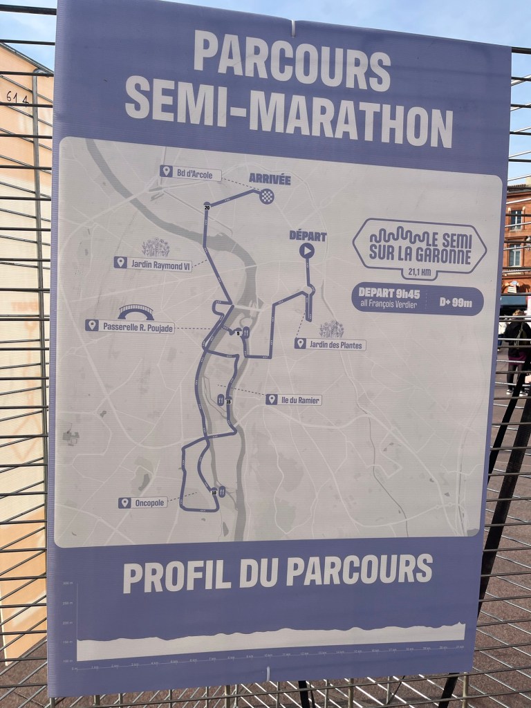 I was surprised as there was a sign saying there were 35,000 runner between the various races – marathon, half-marathon and 10k. That seems an inordinately large number of runners for the streets of Toulouse. I have run or walked most parts of the course in my regular ambling around the city and they have tried to stay on the larger streets but they are still not super wide. One good things is that the different distances have different start times so the runners will be somewhat staggered. Also they have wave starts that will help.