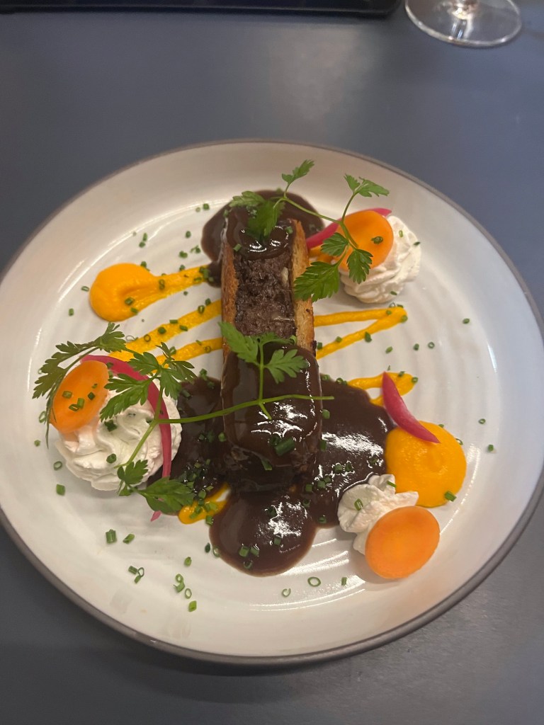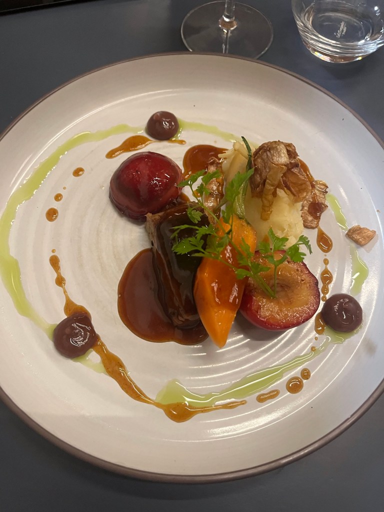 The meat course was slowed cooked lamb that again had been shredded and then made into a block. It was cooked with four spices. This is the dish the restaurant is known for according to the chef. He also makes a reduction of the juices with red wine and cooks it for hours. He told me his girlfriend requires that he brings it home with him whenever he makes it. I can understand as the jus is incredibly flavorful and delicious. He offered to add more to my plate if I wanted it as I ate it. The dish was served with parsnip purée, roast carrots (this always seems to be an accompaniment at whatever restaurant I go to) and roasted plums (for the acid according to the chef). The garnishments were roasted fig purée and parsnip chips. The dish was fantastic!