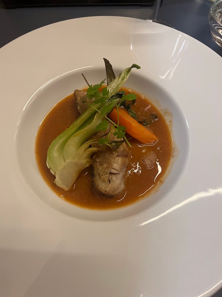 The fish course was a kind of cod that was cooked perfectly and was served over mashed potatoes with chorizo. There was a homemade fish soup that was poured over the whole dish. The fish was crusted with nuts and baked. The chefs mixture of textures and flavors is amazing. There is not conflicts in the food. It was served with grilled bok Chou and roasted carrots.