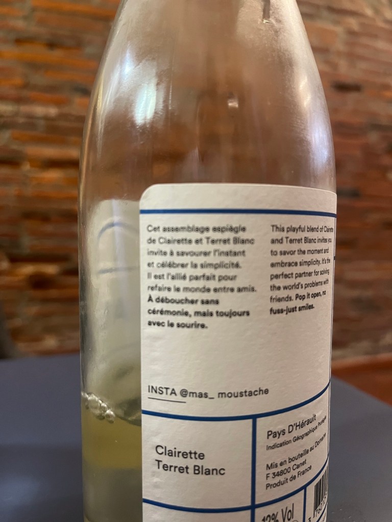 The wine suggested was perfect. It was very crisp and acidic. This helped with all the richness of the food. It was a wine I had never had before which is part of my goal of eating and drinking in Toulouse. It was called Social. The vineyard is Mas Moustache and is from the Vallee d’Herault. Herault is located between Carcassone and Montpelier. I have ridden the train through this area and seen the vineyards growing the grapes from the train window. The grapes are Clairette and Terret Blanc both grapes I am not really familiar with. I had another wine with Terret Gris -tharséo but not Terret Blanc.