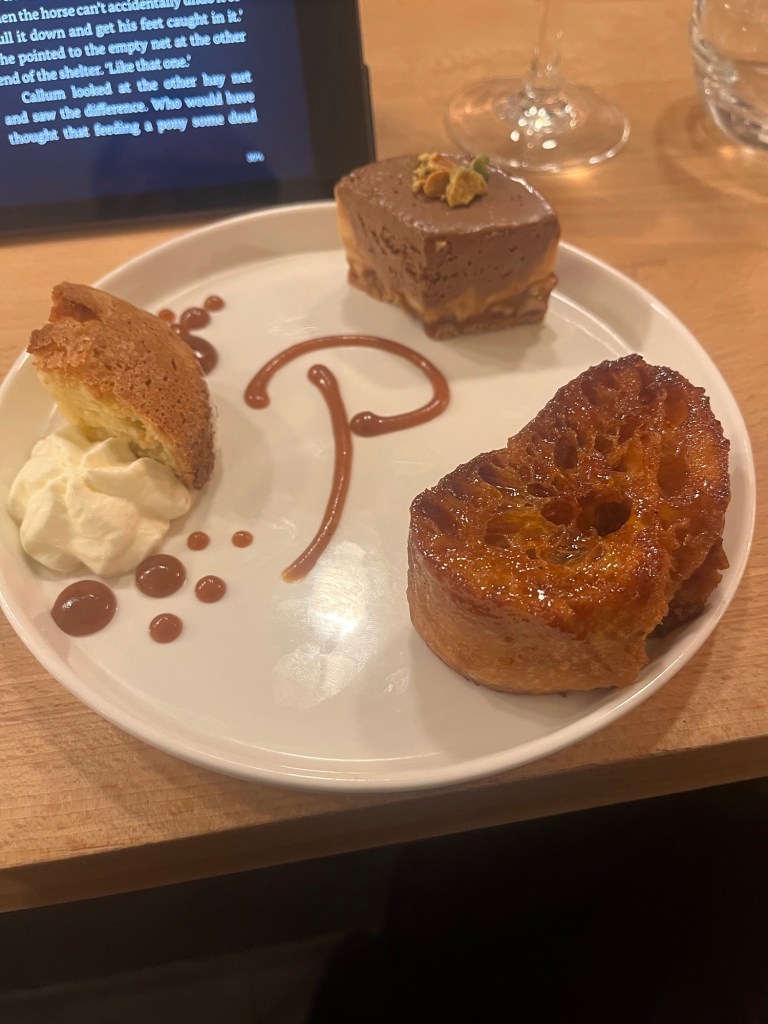 I had the Cafe Gourmand (without the coffee) for dessert and the plate had my initial as part of the presentation.