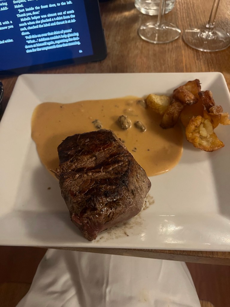 I had streak with morello sauce for my main course. They serve roasted potatoes and salad with the steak. The size of the bowls that came to my table were so large, I could never have finished either by myself. It might be that all the bowls are family size so you get them no matter the size of your table.