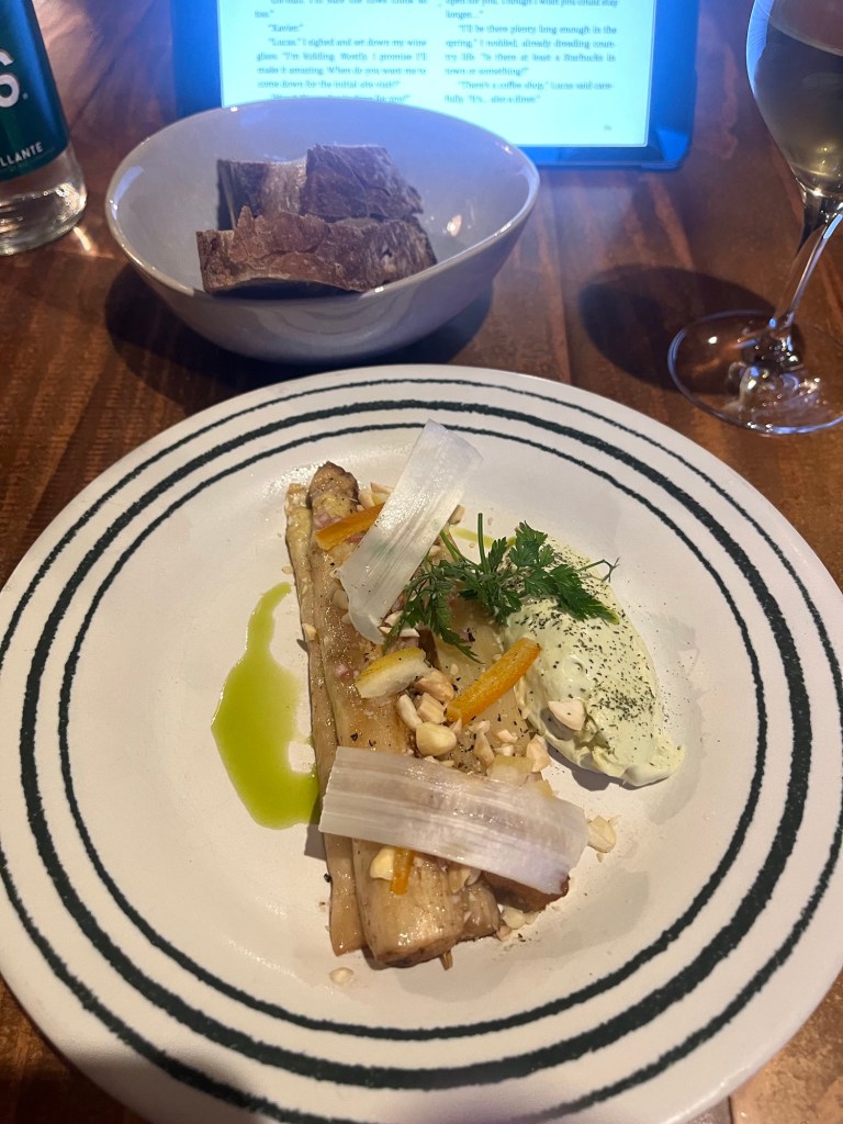In the evening, I had reservations at Reflets. It is another of my go to restaurants in Toulouse. The meal was as good as I remember. My first course was grilled white asparagus with a citrus sauce. The asparagus was very tender and nicely charred. The citrus rind added a nice flavor. There was a goat cheese mouse on the side.