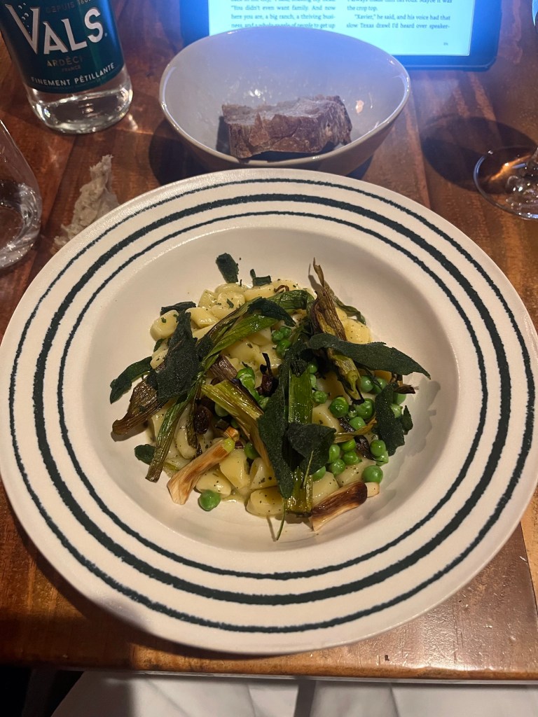 For the main course, I had gnocchetti with green peas and crisp sage. I am a big fan of fresh peas so this dish was right in my flavor zone. The was another citrus sauce on it which gave it a nice brilliant flavor. I had a nice glass of white burgundy with it.