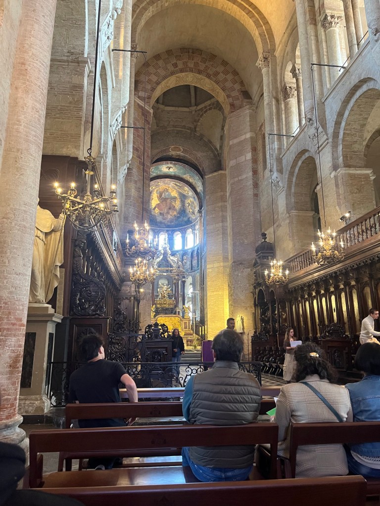 After shopping and breakfast, I headed over to Saint Sernin for the English language mass. As I have mentioned before, getting to the Anglican Church is somewhat problematic from where. I live and it is only held every other week. I think it is even harder now as I read (in the French news) that the nearest metro stop is closed until May 5th. Since I still want to go to church, I just go to the English Mass at Saint Sernin. The location is beautiful and I can follow the service as it is very similar to the Anglican/Episcopal service. It is pretty well attended very week.