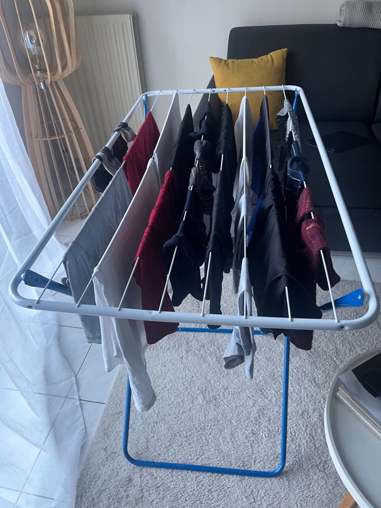 There is no dryer so all laundry has to be line dried. I have actually embraced this even in Alexandria. I still use the dryer in Alexandria for sheets and towels but am more open to line drying other types of laundry. There is a nice drying rack with the apartment and it holds basically all the clothes I wash. I think I have mentioned that I only bring one week (7 days of clothes) with me. So doing laundry is essential once a week. The drying rack holds all my essentials that I wash once a week.