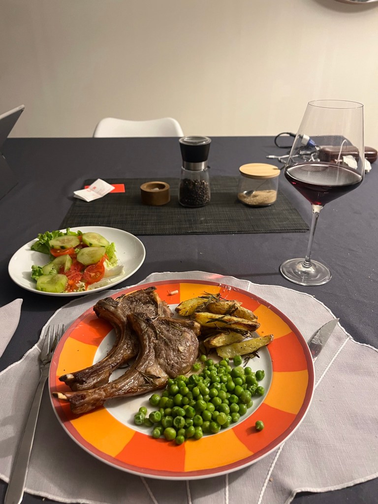 In the evening, I made dinner and had lamb chops, fresh peas, rosemary potatoes and salad. I am still getting used to the oven settings but ended up with a good meal. The wine went well with dinner so overall it was a good day of shopping and eating.