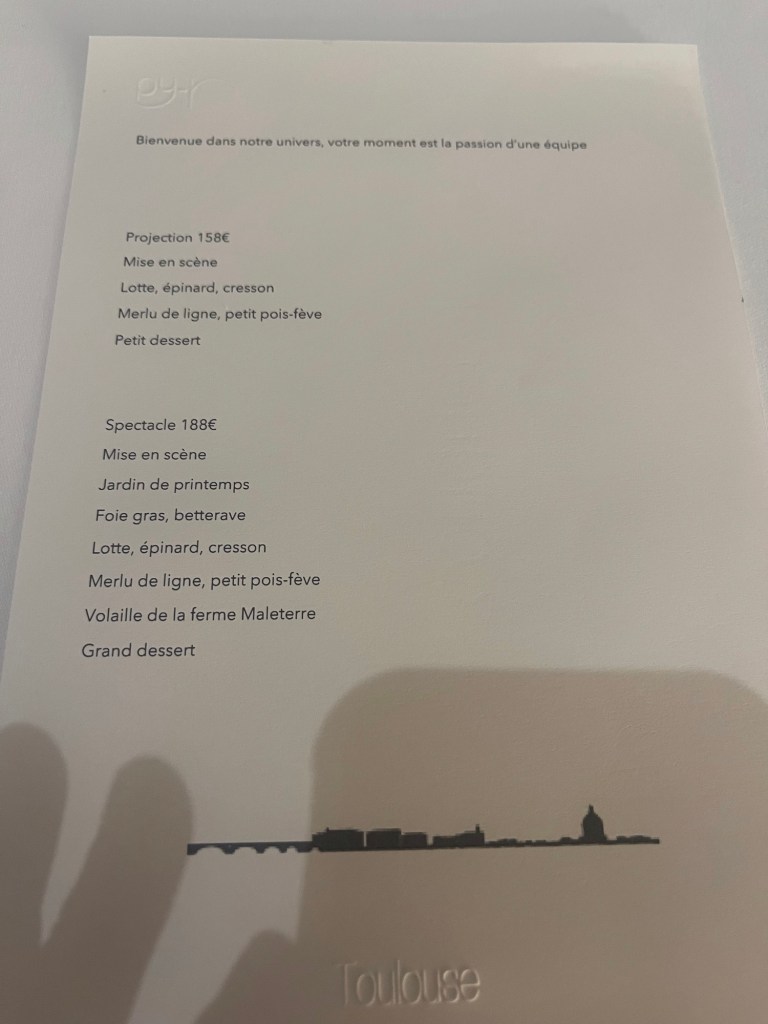 Pamela, Kimberly and I had dinner at Py-R in Toulouse. It is a 2-Star Michelin rated restaurant in Toulouse. The Michelin website describes it as follows: