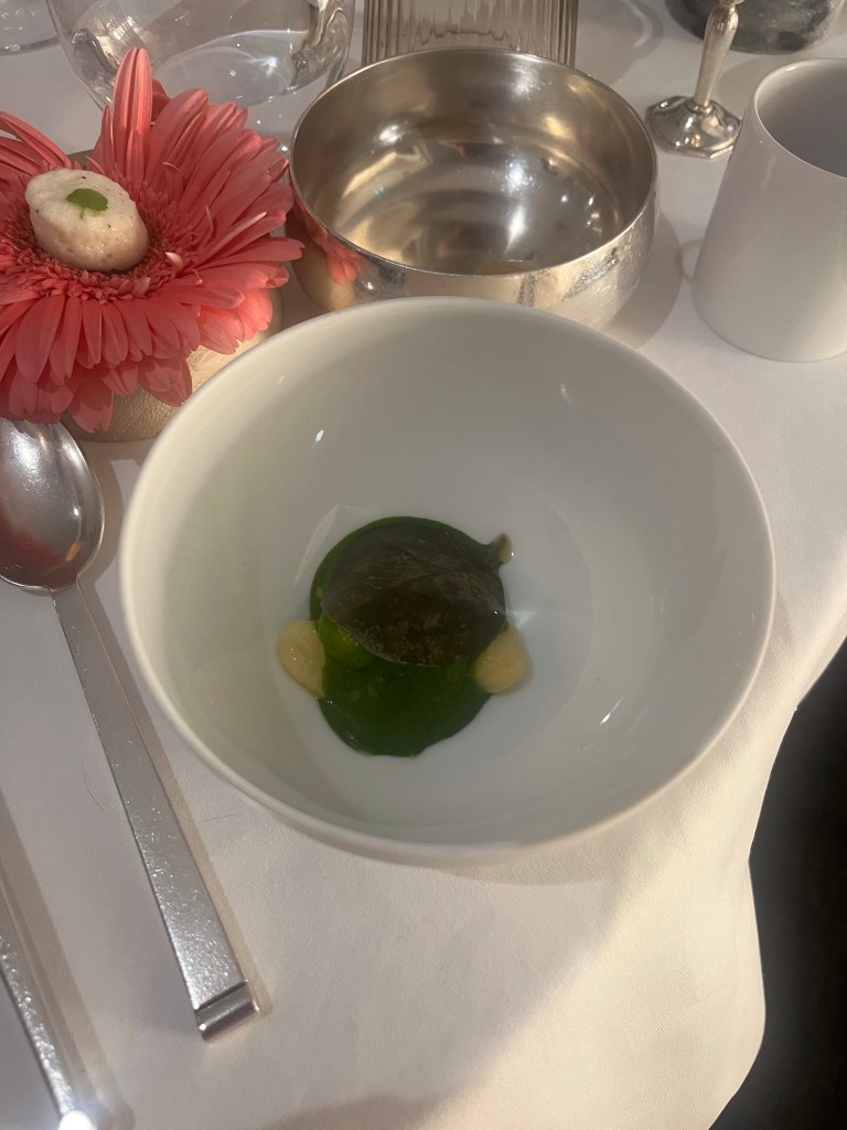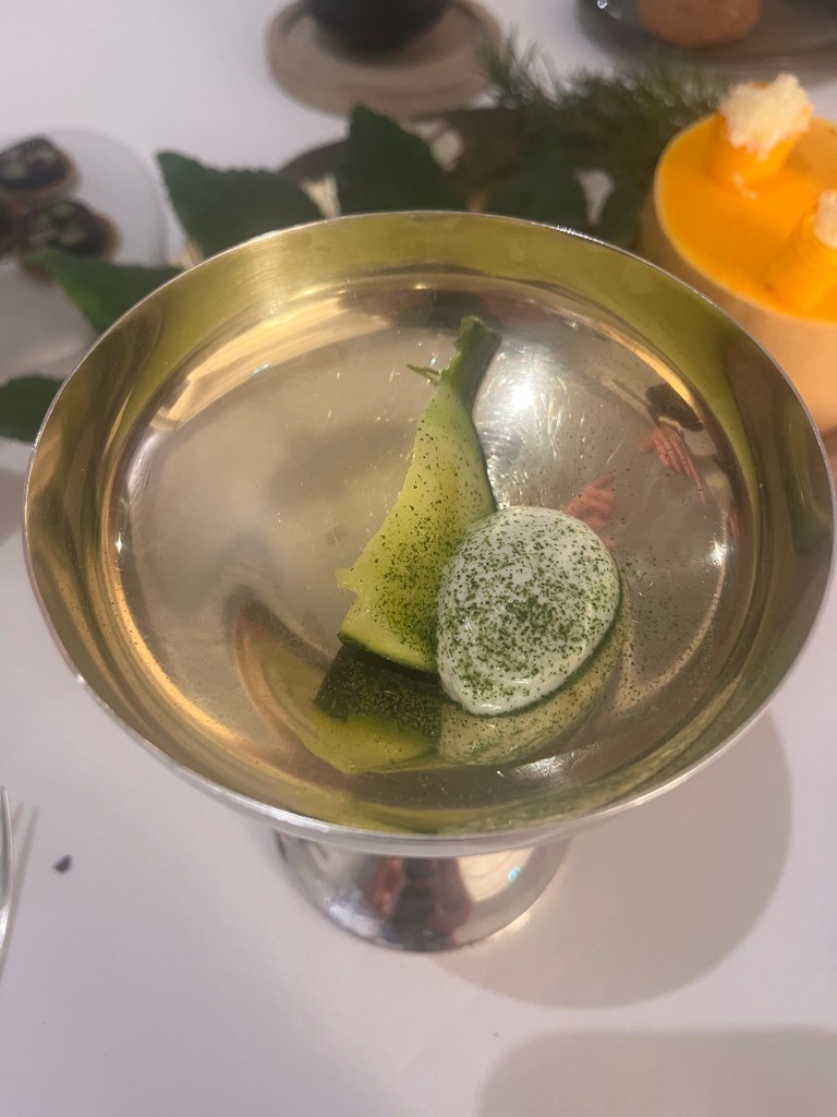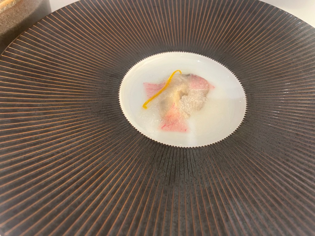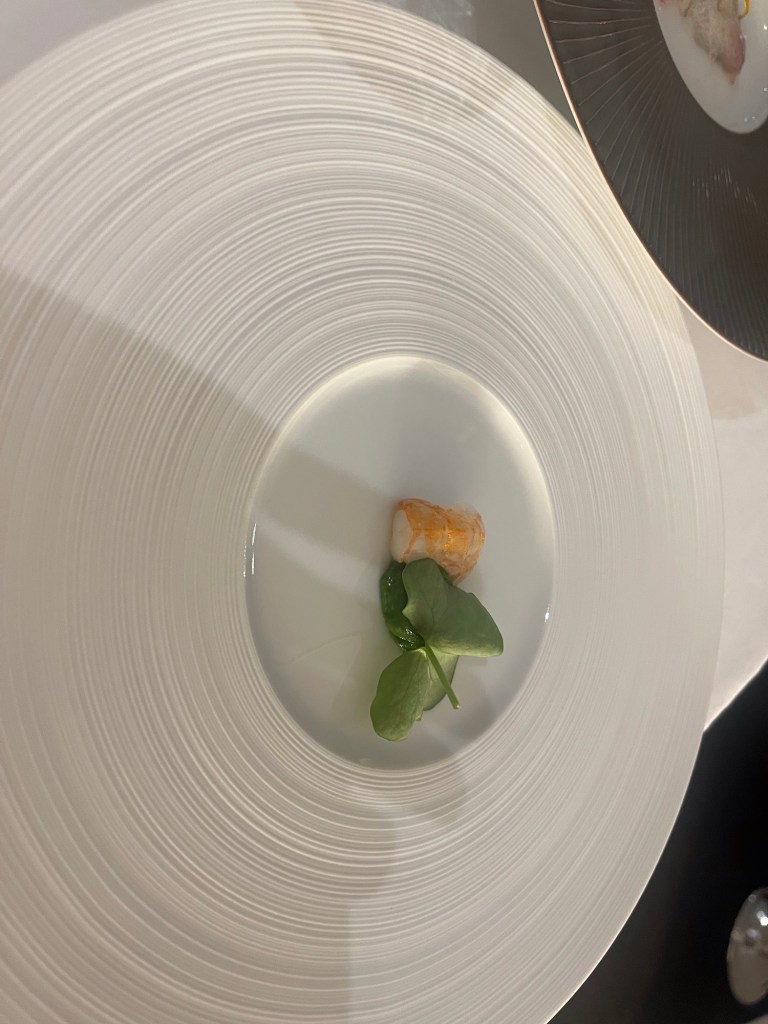 Langoustine silver sorrel, bonito broth, pearl of Japan