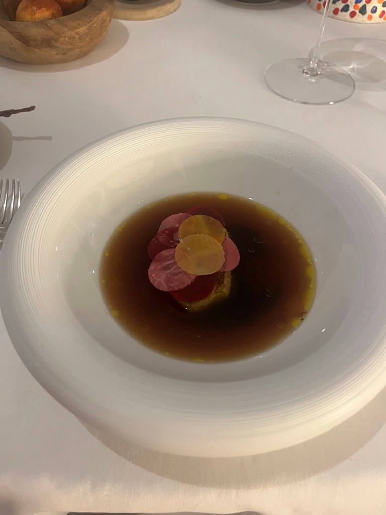 Pan-fried fois gras from Gers, beet pickles, duck juice