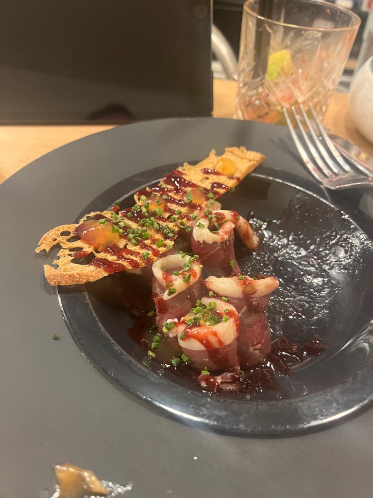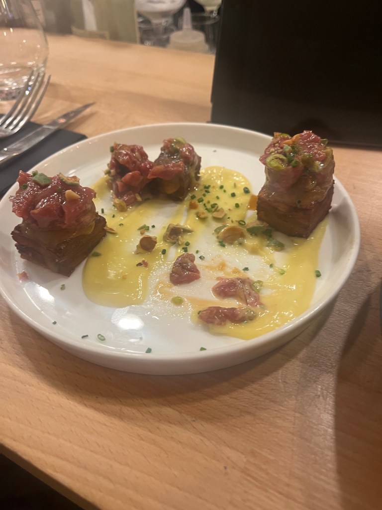Dinner was two of their share options. The first was Gravlax Canard – duck cured and sliced thinly. The second was beef tartar on mille fieulle potatoes that are crisped on the outside.