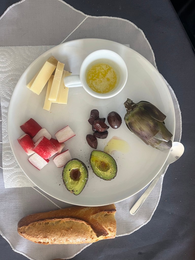 Lunch today was eclectic – I had an artichoke, the small avocado, Beaufort cheese, French radishes, olives and baguette. This is one of my favorite kinds of lunch. It is grazing at its best.