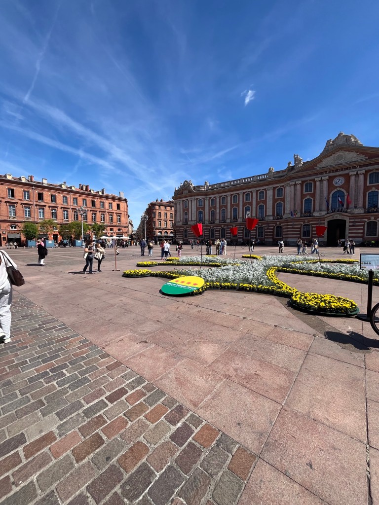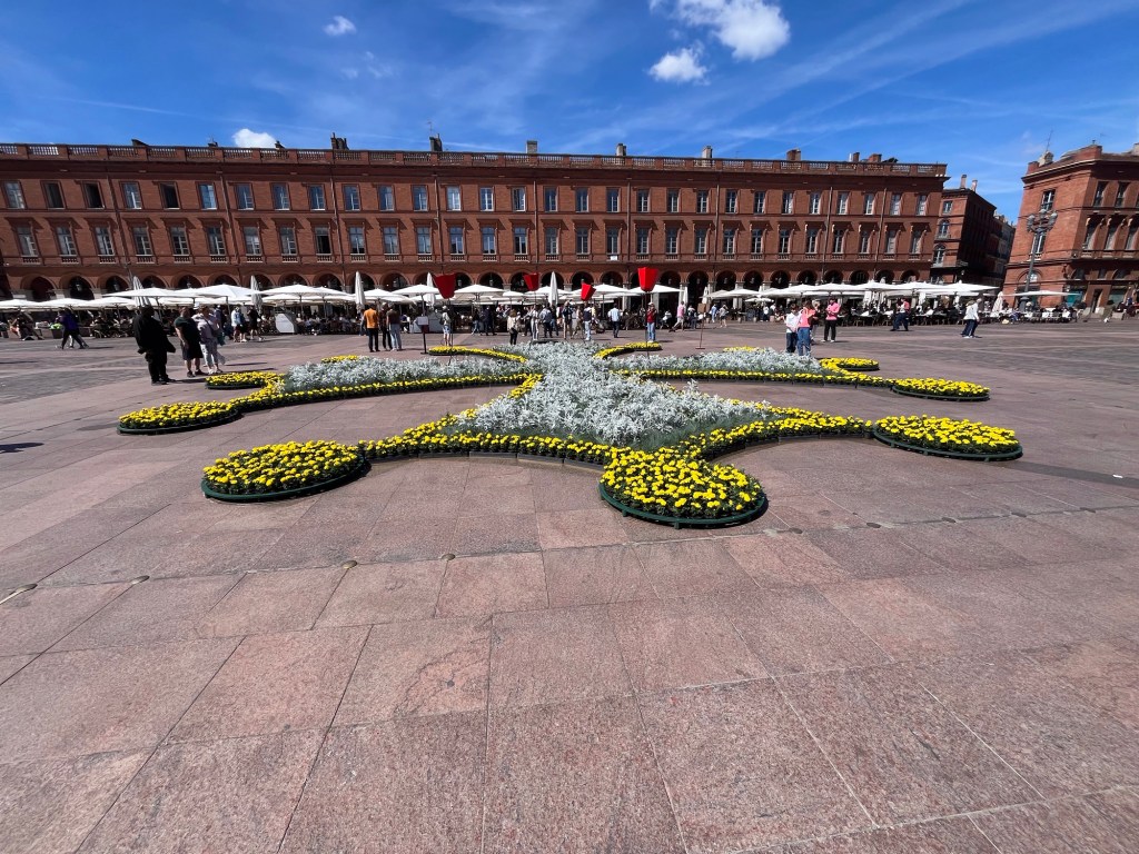 This morning I did some of my usual wandering. I am glad I walked through the Place du Capitole as they had set up a flower display in the center of the place. In the center of the plaza is an astrological display which is in the sign of the Toulouse cross. Until reading about the it today, I did not know it was the Toulouse cross, I just thought it was astrological. There was a large flower display over the center celebrating the year of villages and cities of flowers. The city horticultural services had set up the display.