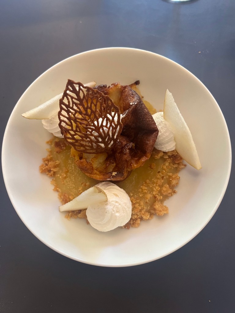 The dessert was Clafoutis – Pierre told me it was a very traditional French dessert. It was one of the best things I have tasted in a long time. I am a fan of pear in general so that added to the goodness of the dessert. IT was layers of pastry with cooked pears within the pastry. The pears were sweet and soft in a custard, great texture and rich flavors. It is served with whipped cream on a pear purée. It is definitely a dessert I would have again. I looked up the recipe and it seems that most are made to be served as slices but there were individual servings.