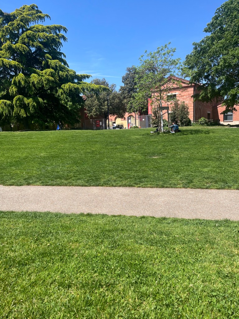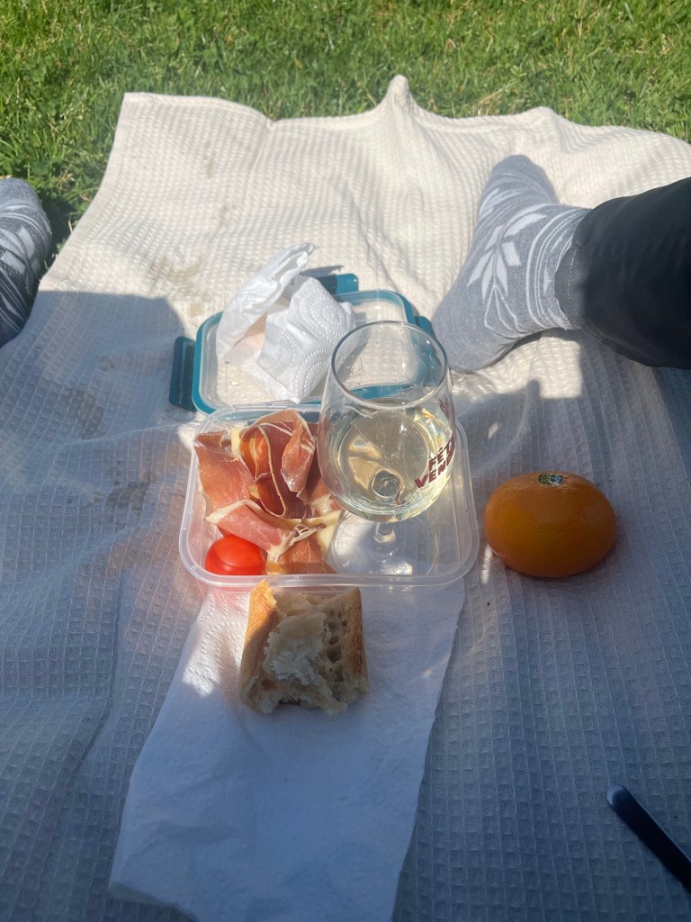 I decided to break up the routine a little and went for a picnic for lunch. I took some cheese, jamon, a baguette, cherry tomatoes, a small avocado, clementine, cookies and wine and walked over to the Jardin Raymond VI to have lunch. I took a nice, small towel that Phil Le had given me from On to sit on. It was a beautiful day and a perfect place to have a quiet lunch, read and watch people.